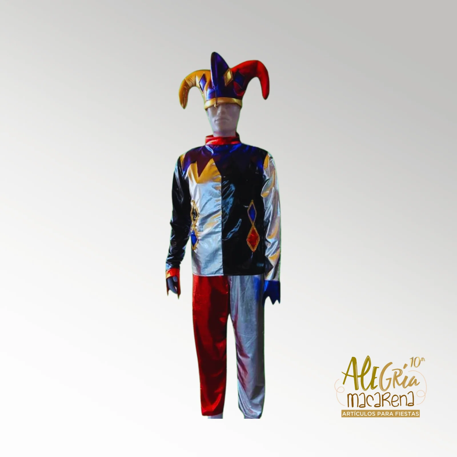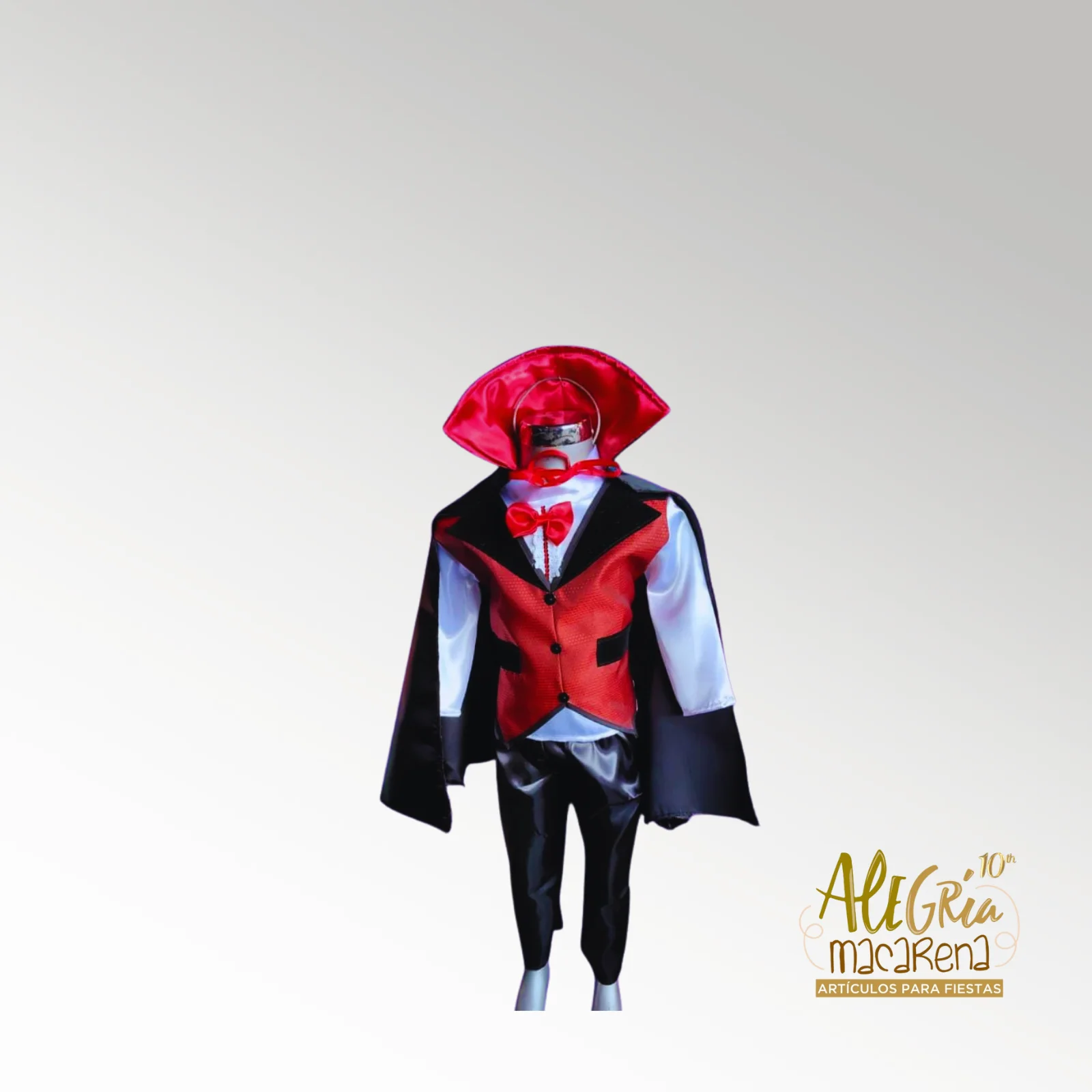 Incluye camisa, pantalón, chaleco, moño y capa.