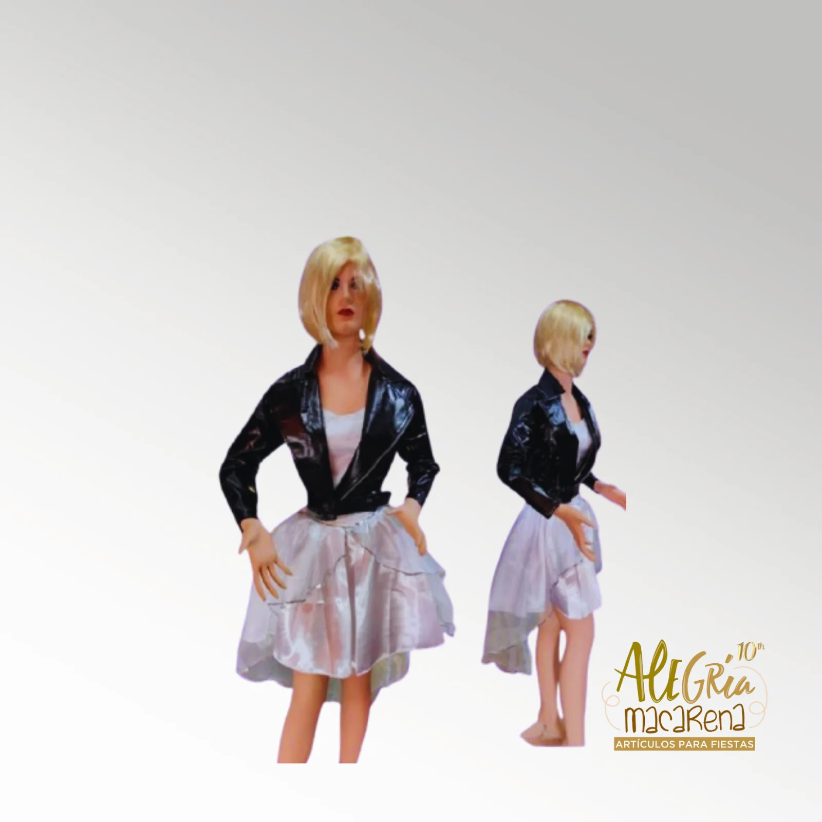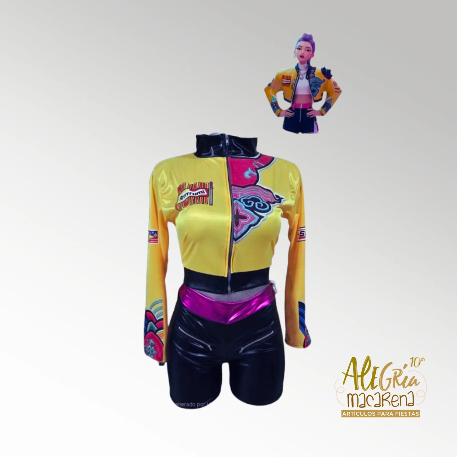 Incluye playera, short, chamarra y guante de lentejuela, falda, cinturón y gargantilla.
