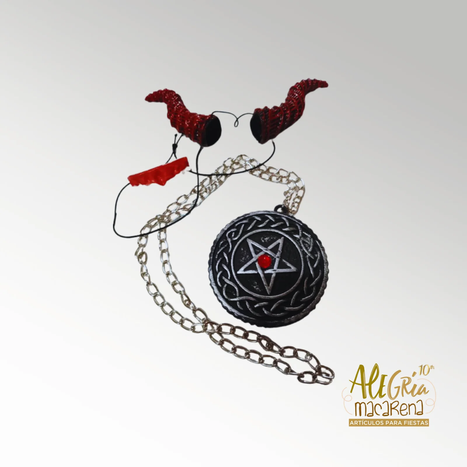 Kit de Demonio incluye: dentadura, cuernos y medallón.