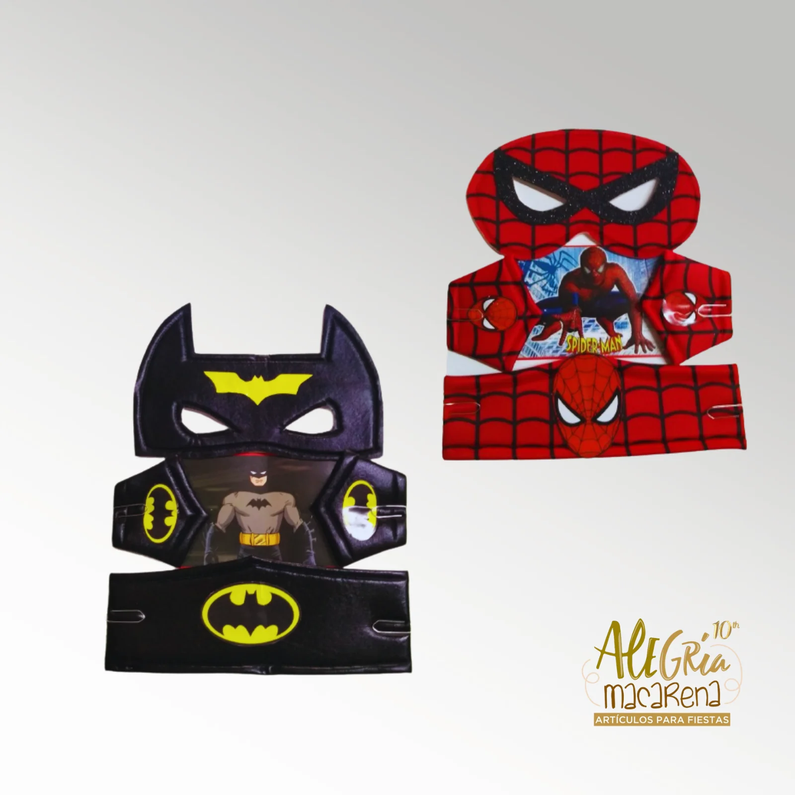 Kit de Super Héroes incluyen: Antifaz, muñequeras y cinturón, varios personajes.